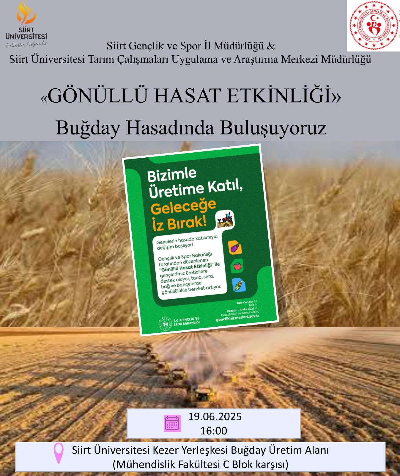 Tarım Çalışmaları Uygulama ve Araştırma Merkezi Müdürlüğü ve Siirt Gençlik ve Spor İl Müdürlüğü’nün 19.06.2025 tarihinde organize ettiği «GÖNÜLLÜ HASAT ETKİNLİĞİ» kapsamında yapılan buğday hasat etkinliği gerçekleştirildi. Etkinliğe Tarım Çalışmaları Uygulama ve Araştırma Merkezi Müdürü Dr. Öğr. Üyesi Semih AÇIKBAŞ, Müdür Yardımcıları Doç. Dr. Ahmet ÇAT ve Dr. Öğr. Üyesi Murat ŞAHİN ile Siirt Gençlik ve Spor İl Müdürlüğü’nden gelen genç gönüllüler etkinliğe katılım sağladımıştır. Buğdayın Türkiye ve Dünyadaki üretimi, yeri, önemi, yetiştirilmesi, hasat edilme süreci ve faydaları konularından katılım sağlayan gençlere bilgiler verildi. Daha sonra Siirt Gençlik ve Spor İl Müdürlüğü’nden gelen genç gönüllülere buğday hasadı gerçekleştirildi.